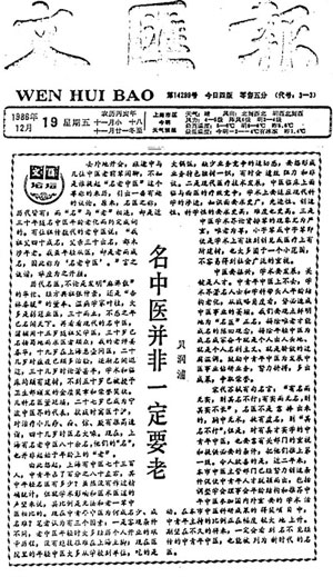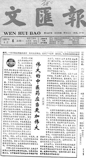 经领导和专业权威高层反复研究选择,这个国际舆论上的导向重任又落到贝润浦医师的肩上。1987年4月6日星期一,《文汇报》头版的『文汇论坛》上再次发表了署名贝润浦的文章〝伟大的中医药应当更加伟大〞。